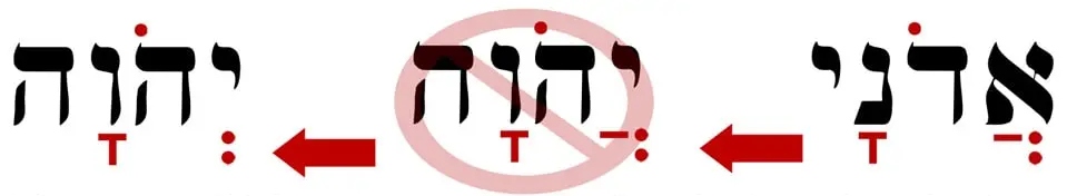 Below is how it looks in Hebrew. Hebrew reads right to left. The consonants from YHWH (black on the left) and the vowels from Adonai (red on the right) are merged. You'll note the merger is not exact, you can't just use the middle word which is exactly the consonants of YHWH (black) and exactly the vowels of Adonai (red). The first vowel (on the right) of Adonai has to be adjusted in order to be used with the consonants of YHWH according to Hebrew language rules. The resulting word (far left) was to be pronounced according to the vowels, not the consonants, so when you saw YHWH consonants with Adonai vowels, you simply said Adonai (Lord). Or, if the vowels of Elohim were used with the consonants of YHWH (not shown here) you simply said Elohim (God).