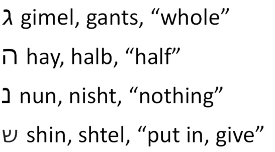 There are four Hebrew letters on the dreidel as shown at right. All players ante into the pot, then roll the dreidel one by one. Depending on the roll, the player either gets none of the pot, half the pot, all of the pot, or has to add to the pot ("put in") as indicated at right. If all the pot is taken, everyone antes again. The winner is the last person to have any coins (or whatever tokens are used). The four letters are an acronym for "a great miracle happened there" (in Hebrew, of course). Here's the phrase: נֵס גָּדוֹל