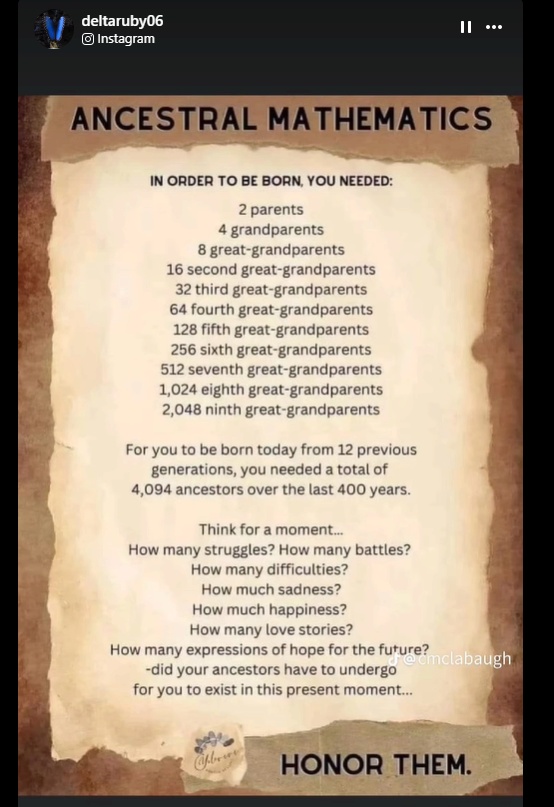 Yet without those people, you would not exist. I recently stumbled onto the chart below. Going back just 400 years (a tiny fraction of the nearly 250,000 years homo sapiens have existed), you have over 4,000 ancestors to whom you owe your life. And as the chart points out at the bottom, you should ponder the trials and tribulations of life they surmounted in order for you to ever exist.