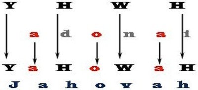 Below is how it looks in Hebrew. Hebrew reads right to left. The consonants from YHWH (black on the left) and the vowels from Adonai (red on the right) are merged. You'll note the merger is not exact, you can't just use the middle word which is exactly the consonants of YHWH (black) and exactly the vowels of Adonai (red). The first vowel (on the right) of Adonai has to be adjusted in order to be used with the consonants of YHWH according to Hebrew language rules. The resulting word (far left) was to be pronounced according to the vowels, not the consonants, so when you saw YHWH consonants with Adonai vowels, you simply said Adonai (Lord). Or, if the vowels of Elohim were used with the consonants of YHWH (not shown here) you simply said Elohim (God).