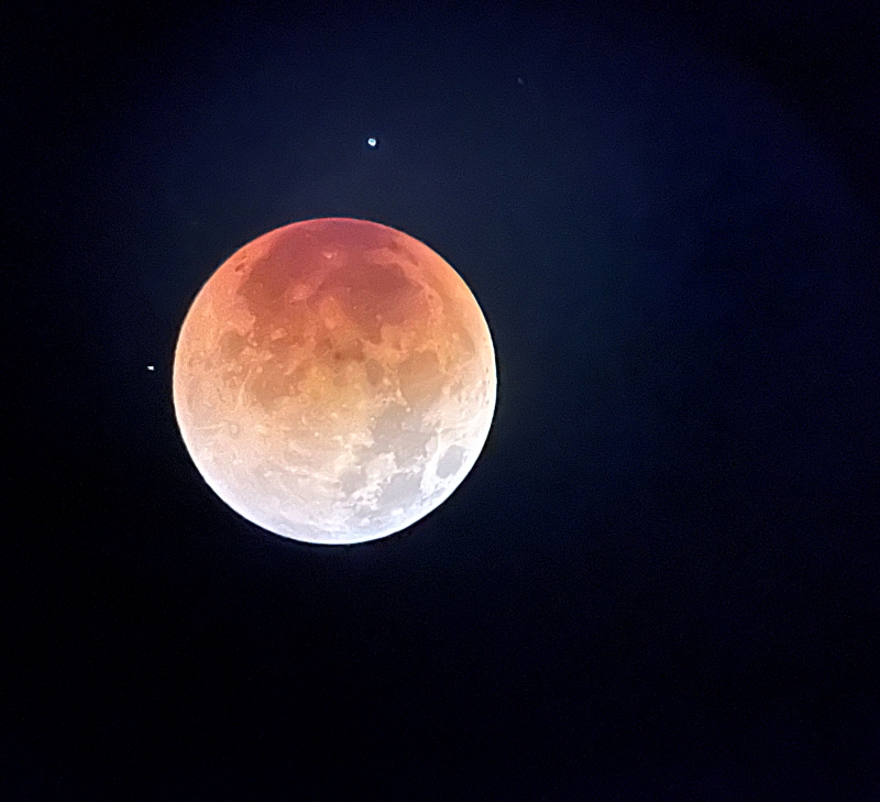 The family had a little front yard Lunar Eclipse party last night. The moon show was only slightly better than watching the kids play around rolled up in blankets and riding kid toys. The nice moon photo was taken with a cellphone looking into a little tabletop 30x telescope; whodathought.