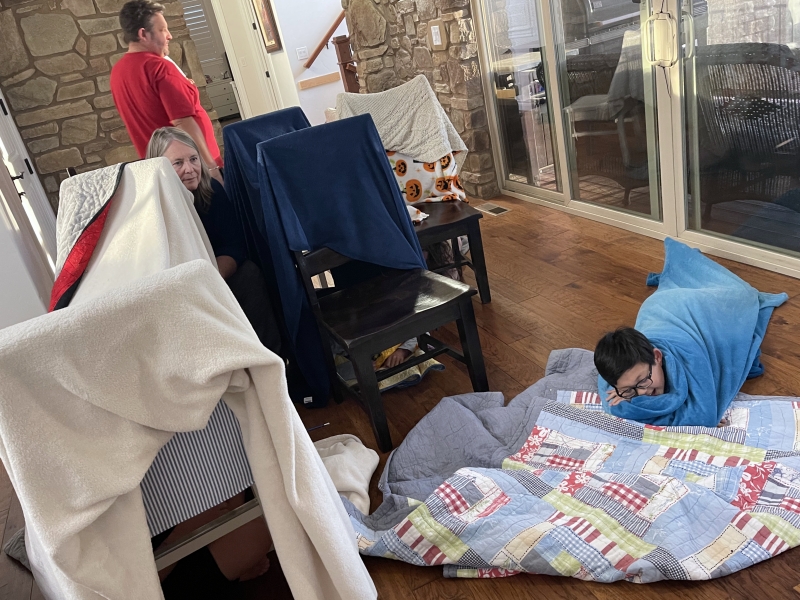 As part of our weekly Family Dinner, we built "booths" in the dining room (see photo) after having shared a brief description of the holiday. If you didn't catch it, the key take away is to remind us what the Israelites lived like while they were in the wilderness and how God miraculously took care of them (e.g. with manna).